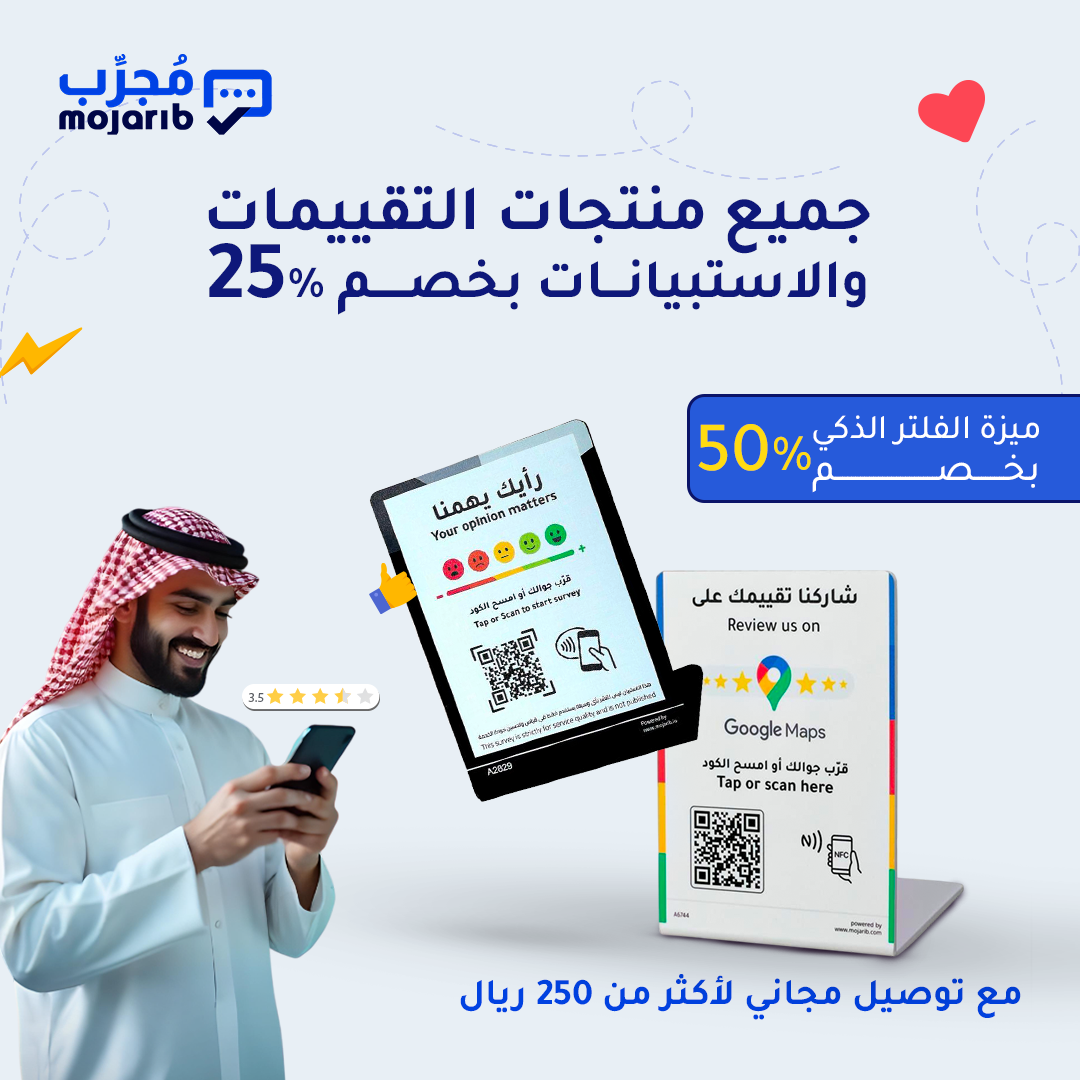باقة استبيان رضا العملاء هي خدمة تقدمها مجرب لقياس رضا العملاء من خلال استبيانات مخصصة يمكن الوصول إليها عبر منتجاتنا من الـ NFC أو ال QR أو عبر روابط مخصصة.