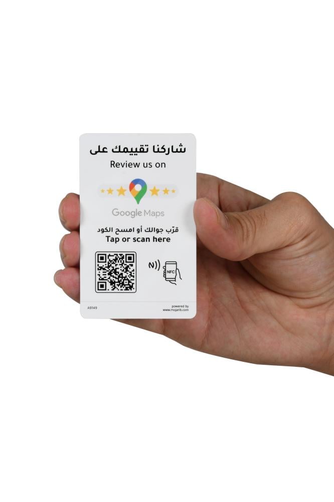 ✨ The Google Maps Review Card is your perfect solution! A card the size of an ATM card 💳, made from high-quality PVC 🪞, integrated with NFC technology 🔗 and a QR Code 📷, allowing your customers to access your Google Maps review page instantly 📍.